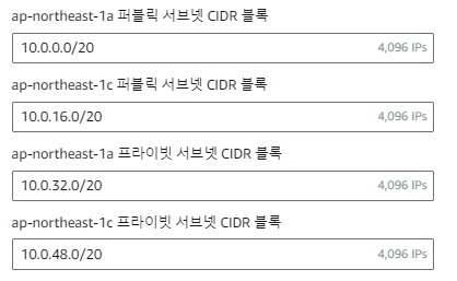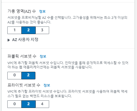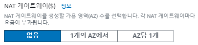 적당한 크기의 CIDR값을 입력하고, 가용영역 수/퍼블릭서브넷 수/프라이빗 서브넷 수/서브넷 수를 원하는 크기로 선택하자. (CIDR에 대해서는 별도의 포스팅으로 다루도록 하겠다)