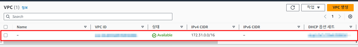 아래 이미지와 같이 default VPC가 보일것이다. 나만의 VPC를 만들기 위해서 오른쪽 상단에 VPC생성 버튼을 누른다