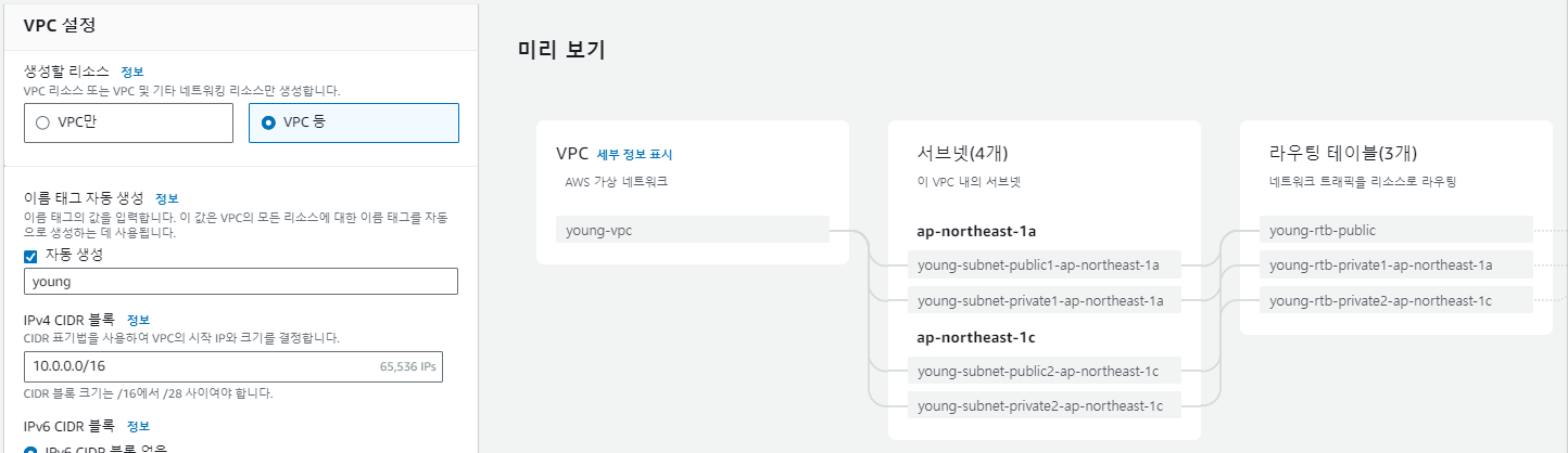 오른쪽의 'VPC 등'을 선택하면 위에 언급한 리소스가 한번에 자동으로 만들어진다.