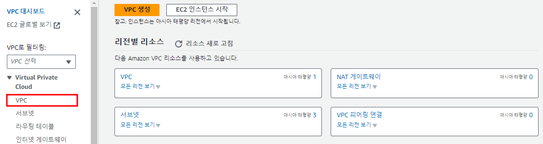 왼쪽 메뉴의 VPC를 눌러서 들어가자