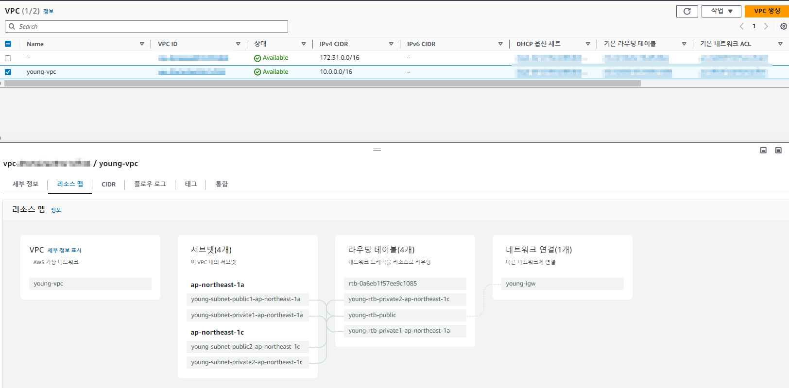 마지막으로 'VPC 생성' 버튼을 눌러 VPC생성을 진행하면, 아래와 같이 새로 생성된 VPC를 확인할 수 있고,