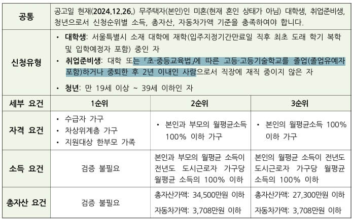 청년의 경우 기본 임대보증금과 임대료가 적용되며, 대학생과 취업준비생은 임대보증금을 100만 원 또는 200만 원으로 낮춰 별도 적용받을 수 있습니다.