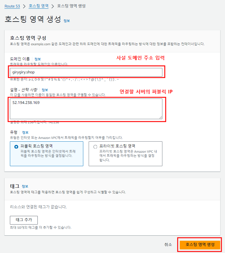 • 값 : 리소스(EC2) 퍼블릭 IP 입력