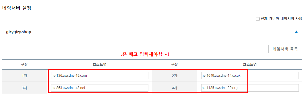 사설도메인 호스팅 사이트에 접속하여, 해당 도메인의 네임서버를 AWS Route53의 레코드 값으로 변경