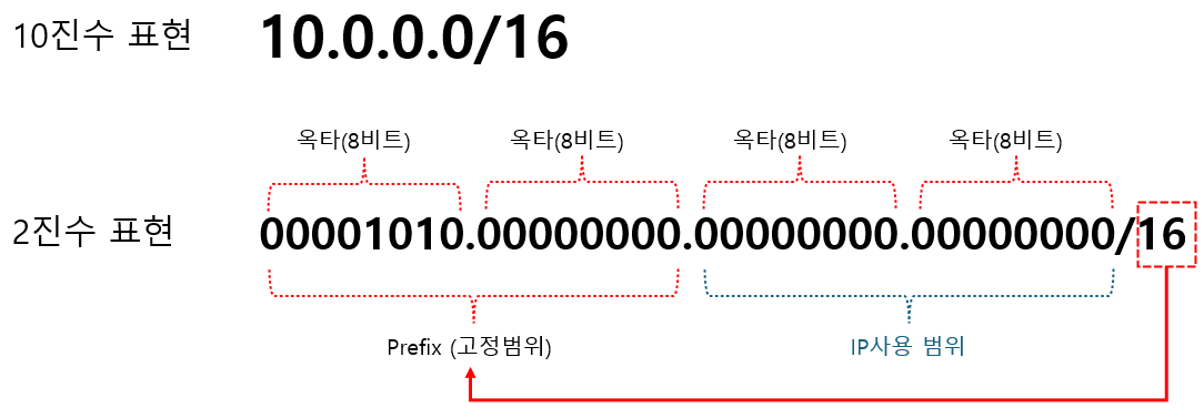 먼저, 10.0.0.0/16을 이진수로 변환해 보겠습니다.