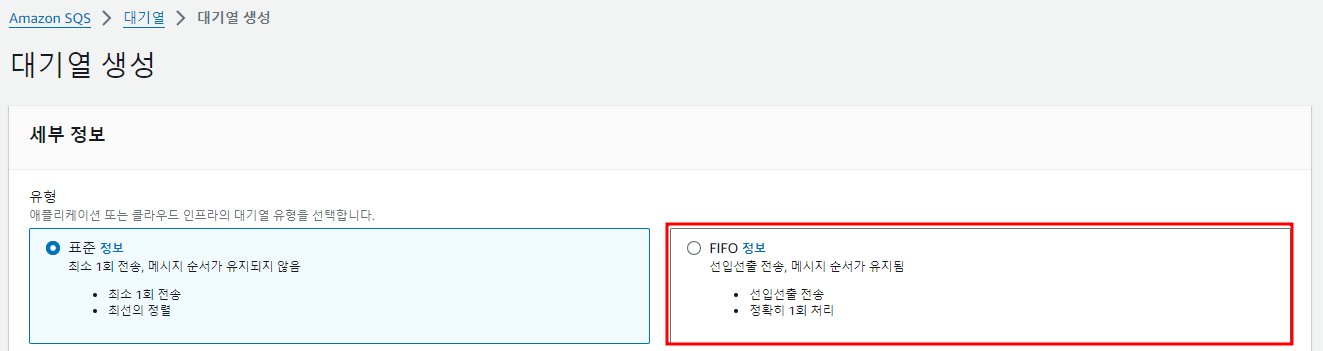 FIFO 대기열 : 선입선출, 메시지 순서가 유지됨