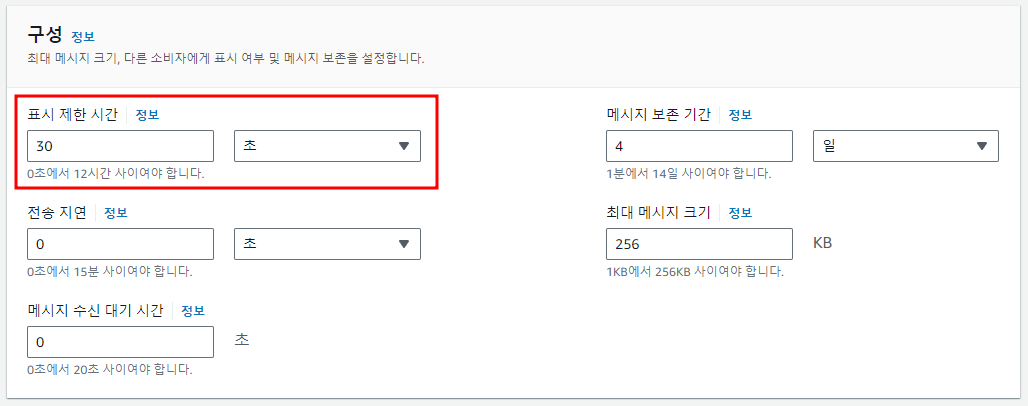 메시지 중복 처리 방지 : 다른 Consumer에서 메시지를 중복처리 하는 것을 방지하기 위해 차단하는 시간을 최대 12시간으로 설정