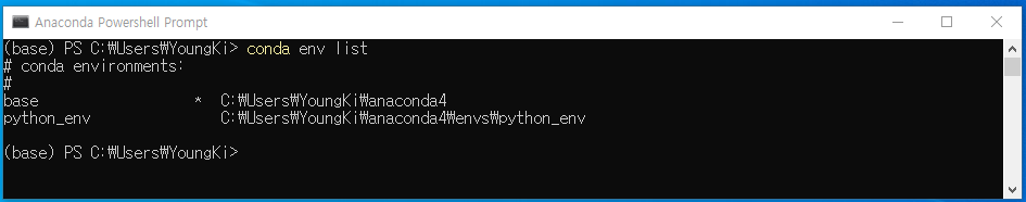 현재는 기본 환경 (base)만 있는 것을 알 수 있습니다.