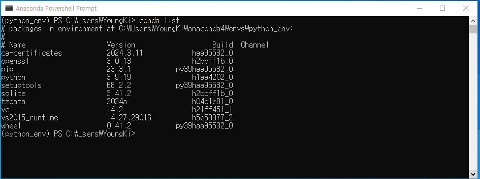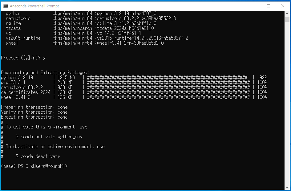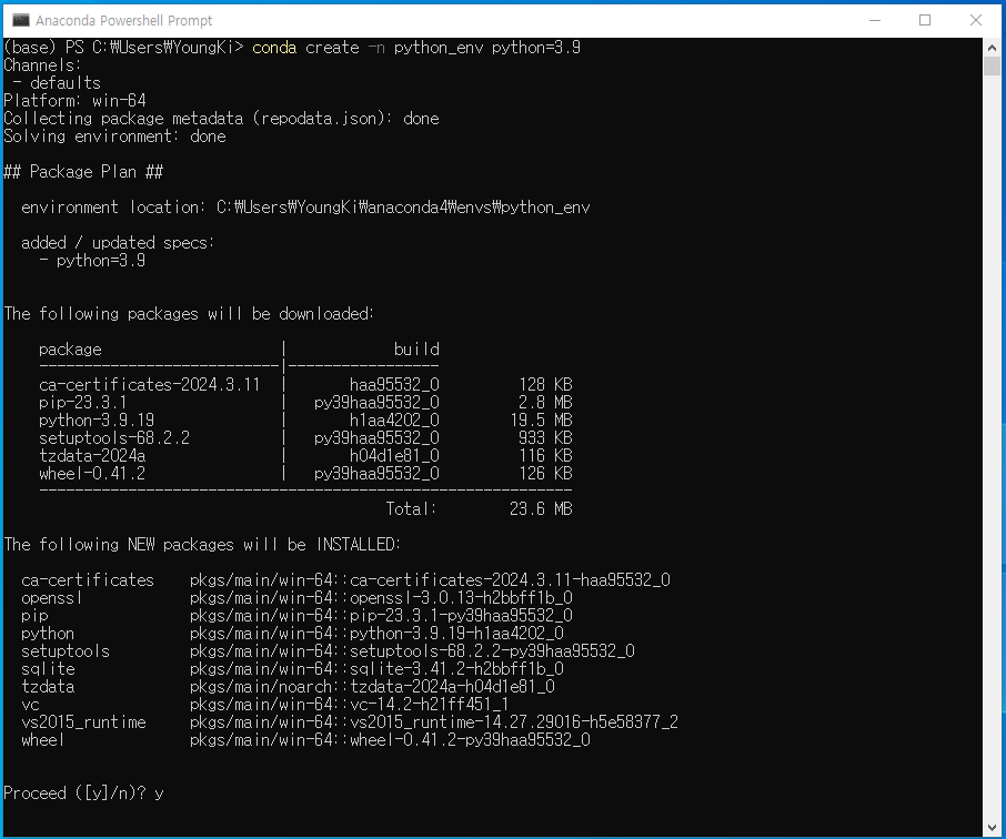 파이썬 3.9 버전을 사용할 pyhon_env라는 이름의 개발환경을 만들려고 합니다.