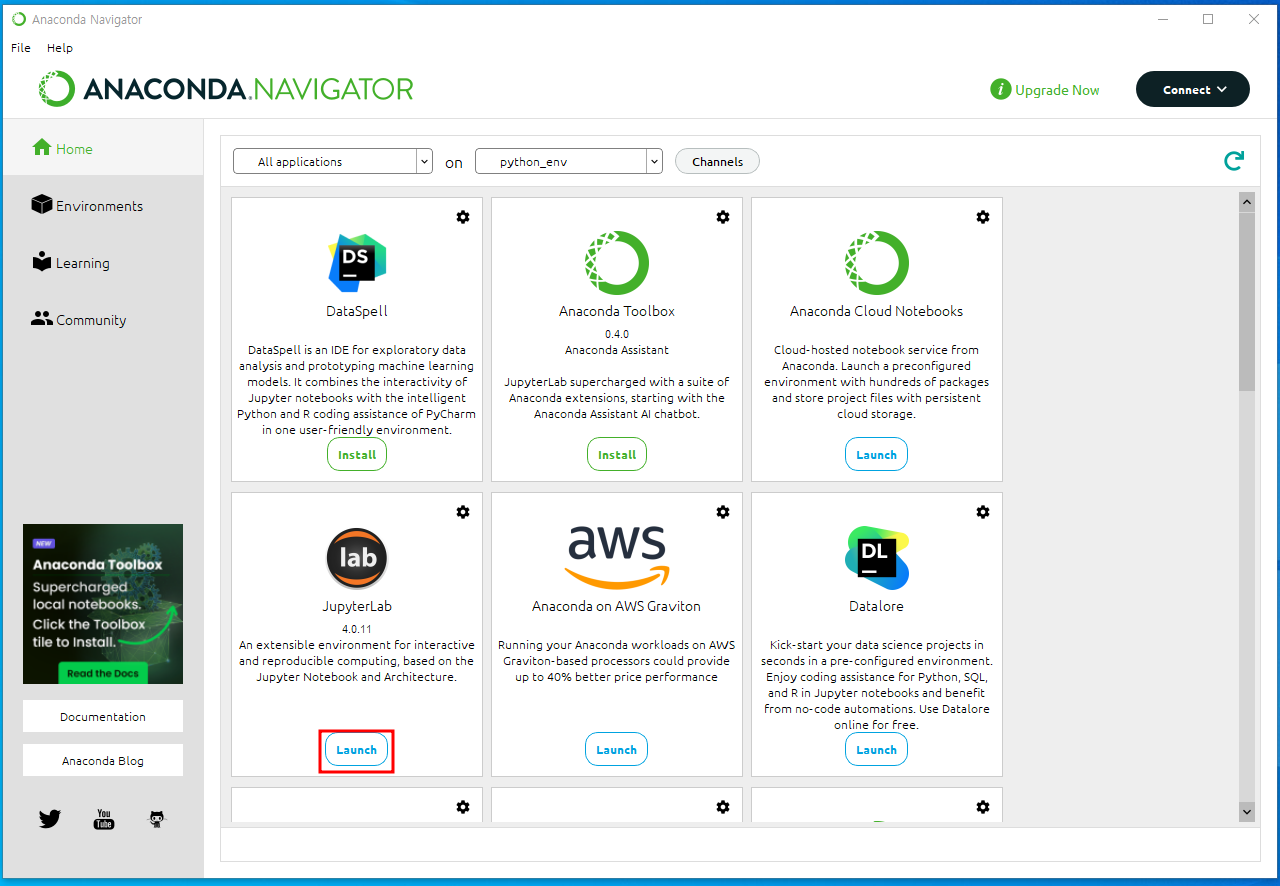 JupyterLab 설치가 완료되면, Install 버튼이 Launch 버튼으로 변경되며, 이때 Lauch버튼을 눌러 실행해 줍니다.