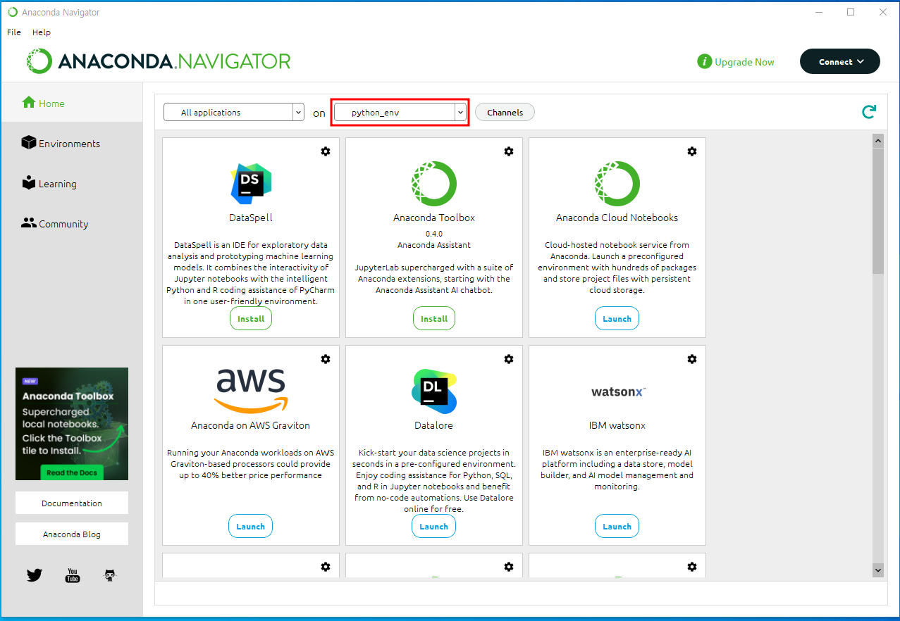Anacoda Navigator를 실행 후 내가 만든 개발환경으로 변경해 줍니다.