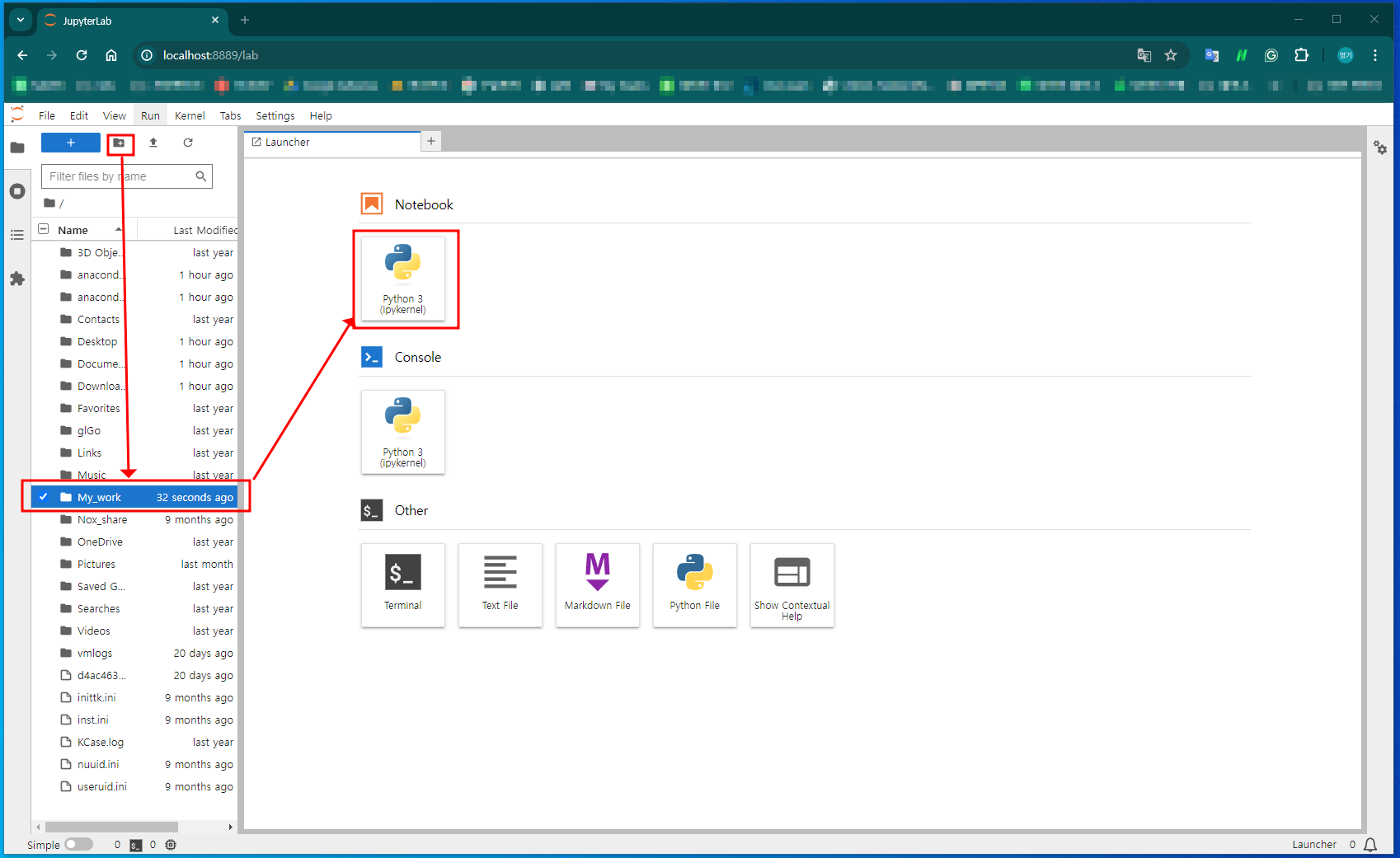 jupyterLab에서 작업폴더를 하나 만들고, 그 안에 Notebook을 만들어봅니다.