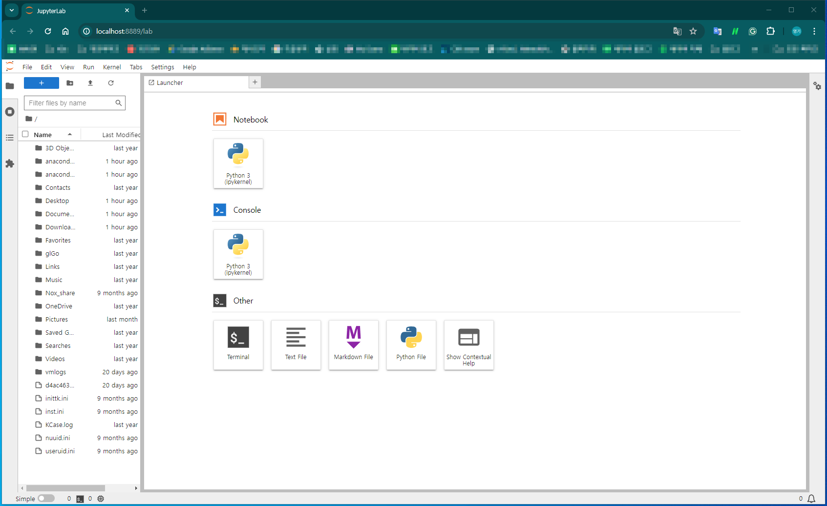 아래와 같이 JupyterLab은 웹 브라우저로 실행이 됩니다.