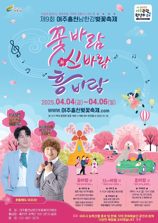 여주 흥천 남한강 벚꽃축제는 경기도 여주시 흥천면에서 열리는 아름다운 벚꽃 축제입니다. 2024년 4월, 전국 축제 1위를 달성하며 35만 명의 방문객을 매료시킨 이 축제가 2025년에도 어김없이 찾아옵니다. 2025년에는 "#올해도 여주로"라는 슬로건처럼, 벚꽃이 만개하는 여주에서 잊지 못할 추억을 만들어 보세요.