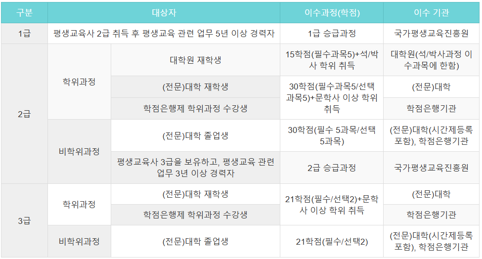 - 학사학위 소지자로서 평생교육 관련 과목 30학점 이상 이수