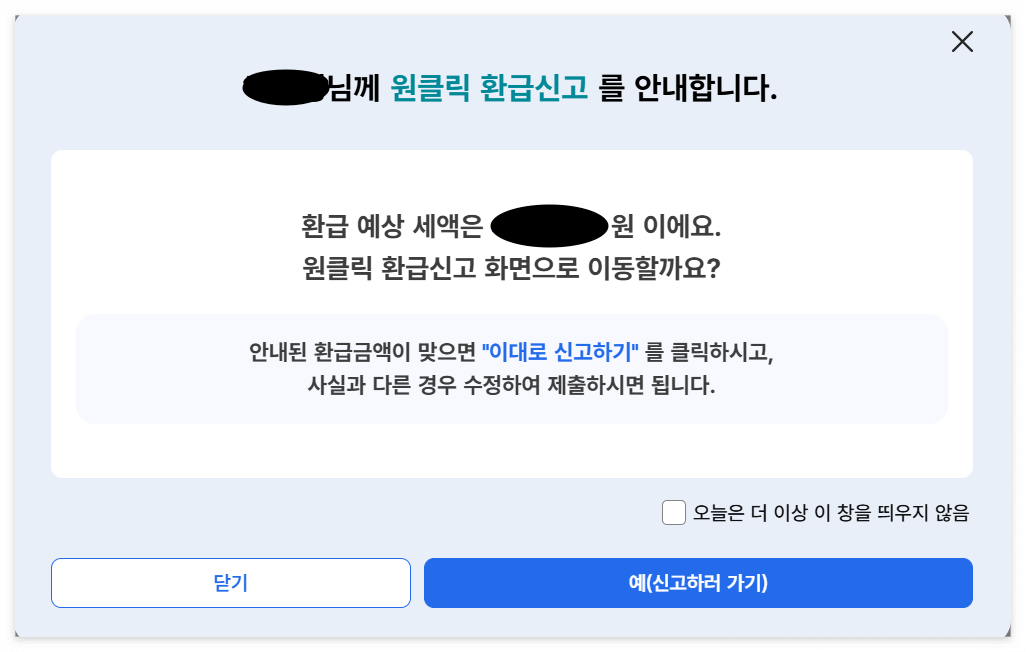 - 환급금 확인: 안내된 금액을 확인하고 수정 사항이 없으면 '이대로 신고하기' 버튼을 눌러 신청합니다.