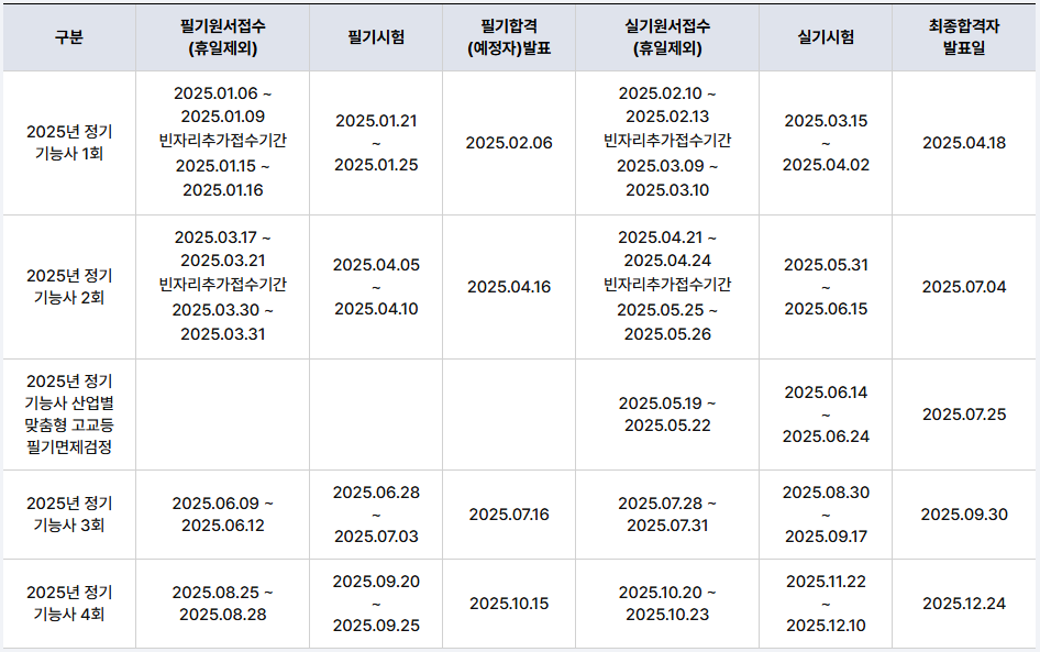 각 회차별 필기·실기시험 일정은 아래와 같습니다(지역별, 회차별 세부 일정은 큐넷에서 확인).