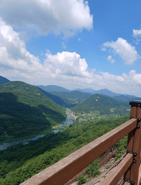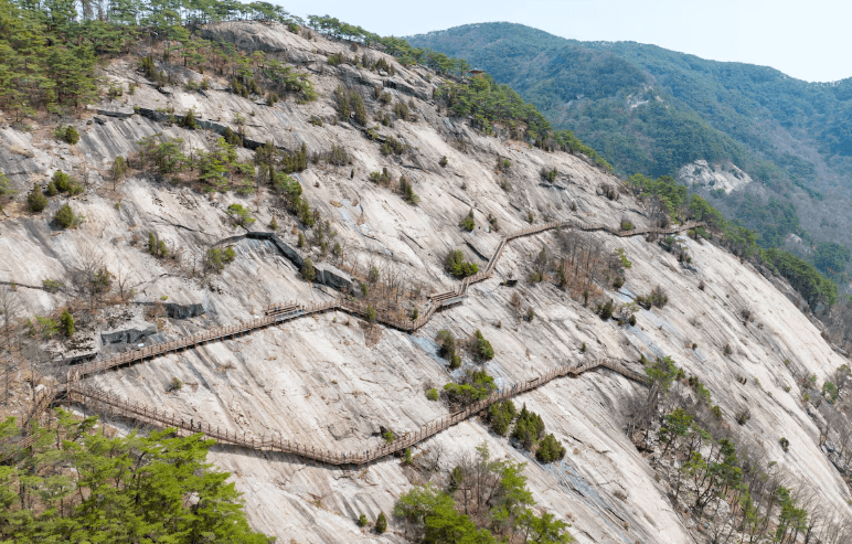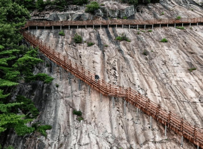 - 잔도(데크)는 바위 절벽에 지그재그로 설치되어 있어 아찔한 스릴을 느낄 수 있으며, 일부 구간은 난간이 투명 강화유리로 되어 있어 짜릿한 경험을 제공합니다.
