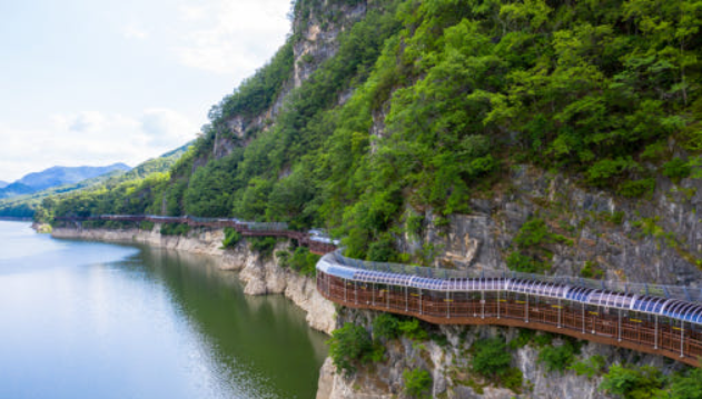 - 단양 잔도길은 중국 장가계 잔도길에서 영감을 받아 2017년 완공된 절벽 위 데크 산책로로, 남한강과 깎아지른 암벽 사이에 설치되어 있습니다. 전체 길이 1.2km, 폭 2m로 대부분 목재 데크로 이루어져 있으며, 일부 구간은 바닥이 투명한 유리로 되어 있어 짜릿한 스릴을 제공합니다.