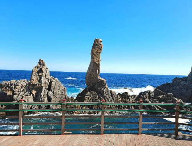 - 길을 따라 걷다 보면 바다 위에 우뚝 솟은 촛대 모양의 바위(촛대바위), 파도에 깎여 형성된 해식동굴(초곡용굴), 그리고 해안 절벽과 동해의 푸른 바다를 한눈에 감상할 수 있습니다.