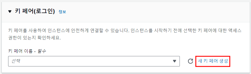 다음으로는, 서버에 SSH로 접속하기 위해 키페어 선택하거나, 키페어가 없다면 새로 만듭니다.