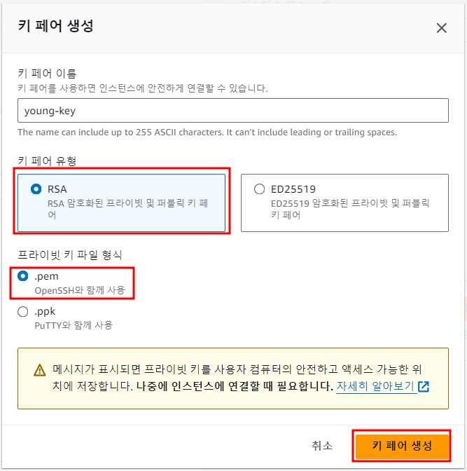 키페어 유형은 RSA, 파일형식은 .pem을 선택하고 '생성'버튼을 클릭합니다.
