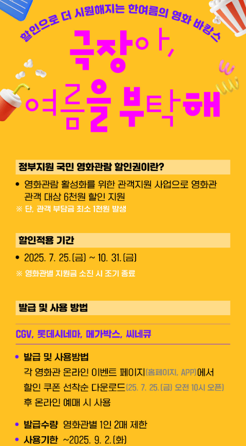 - 예매 방식: 극장별 공식 홈페이지 및 앱에서 쿠폰 다운로드 후 예매 시 할인 적용