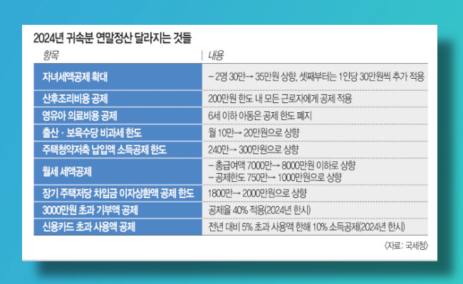 이번 연말정산은 결혼/출산/양육, 주택, 기부금 등의 항목에서 개정된 사항이 많습니다. 2024 귀속 연말정산에 적용되는 소비와 저축, 상환 등에 대해 달라진 공제 내용을 함께 확인해 보도록 하겠습니다.