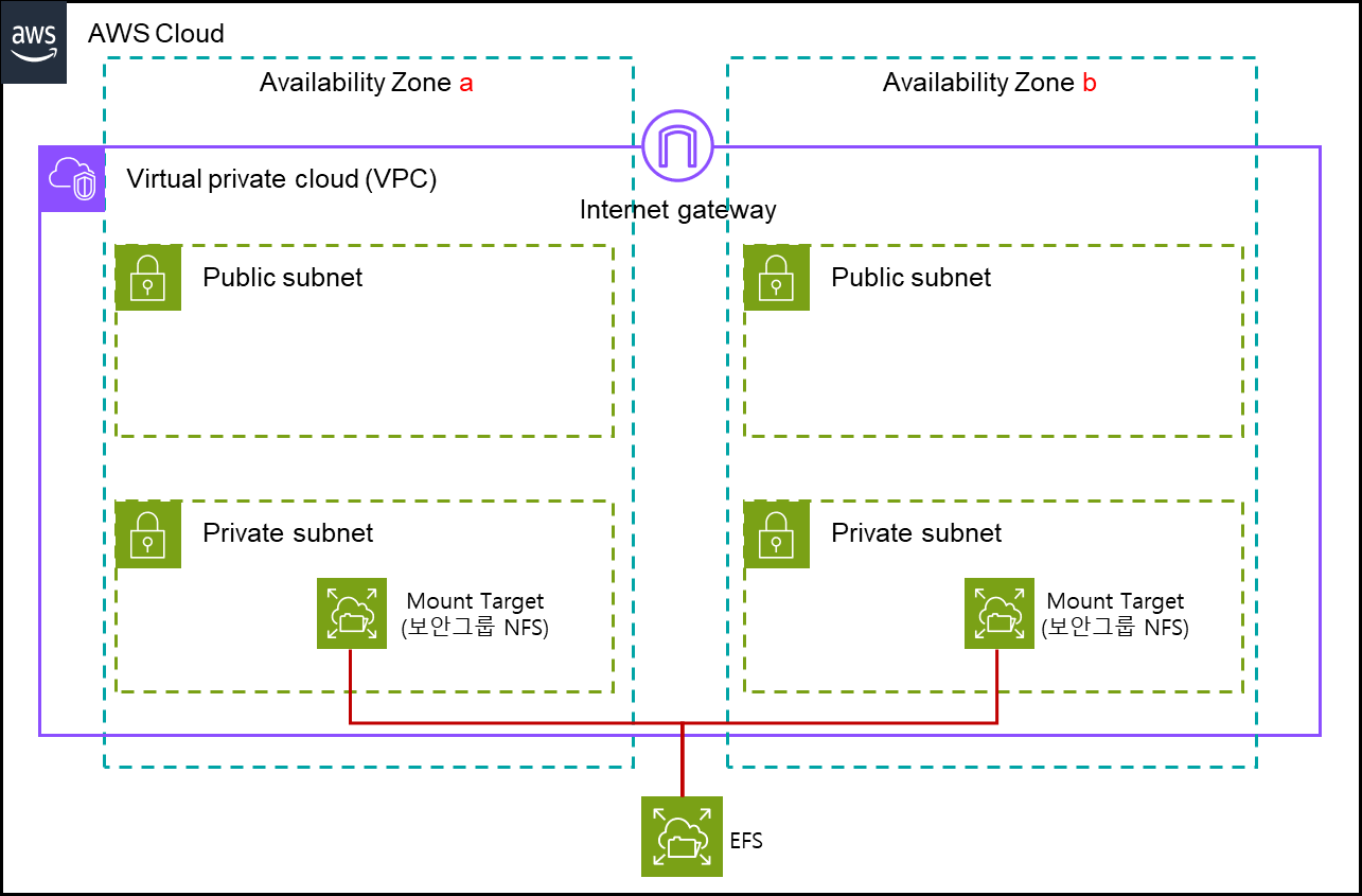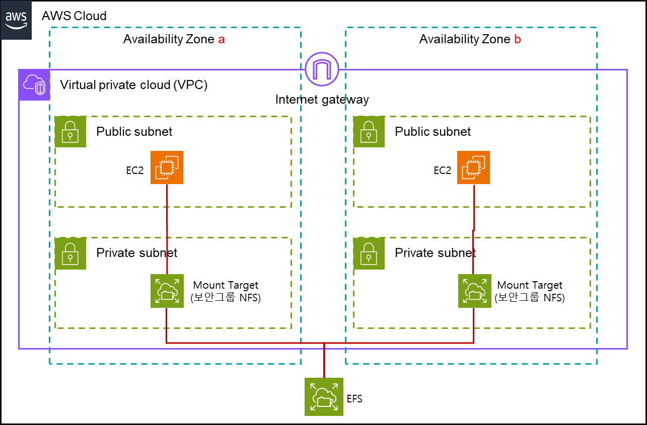 먼저, 지난번에 만들어본 EFS는 이런 형태입니다. 두개의 가용영역에 EFS 마운트를 위한 Mount Target을 각각 배포했고,
