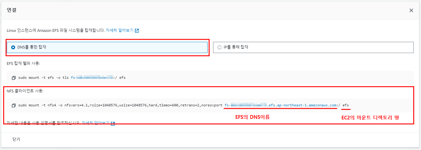 탑재 방법으로는 'DNS를 통한 탑재'를 선택하고, 저는 NFS 클라이언트를 사용해서 마운트를 하는 일반적인 방법을 해보겠습니다.