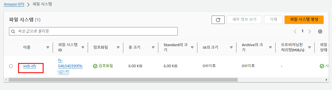 AWS콘솔 > EFS 에서 연결할 EFS 이름을 클릭해주세요.